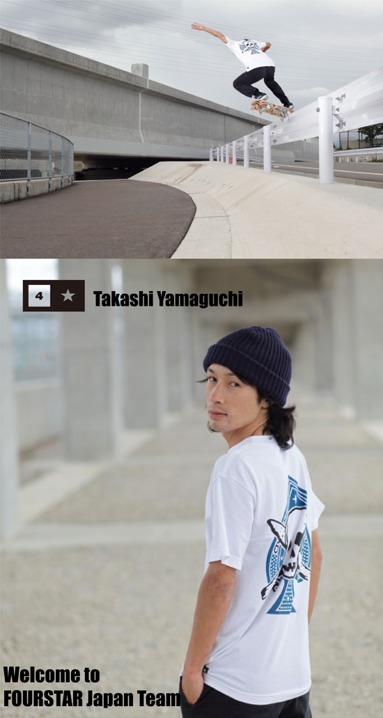 さまざまなスポットに対応する滑りは他ジャンルのスケーターから支持が高い、山口隆志のアパレルスポンサーに「fourstar」が決定いたしました。